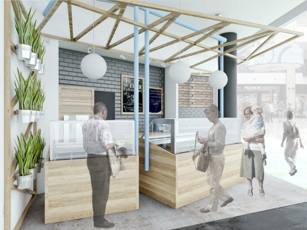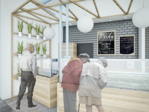 En el espacio irregular/residual en torno al pilar, encajamos los mostradores que servirán para realizar degustaciones de producto.