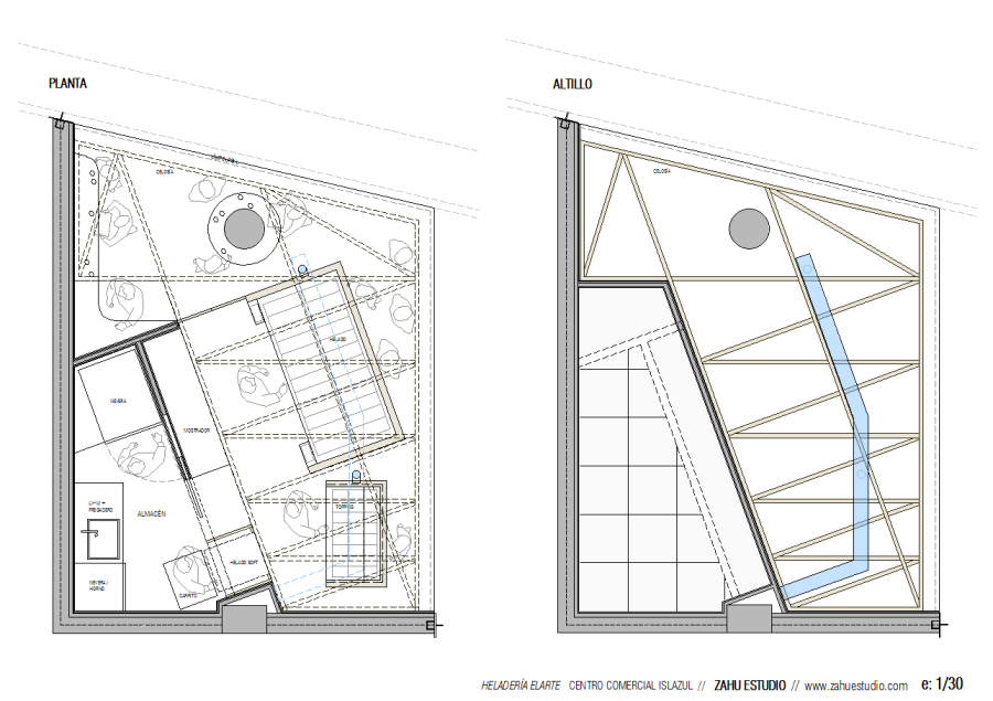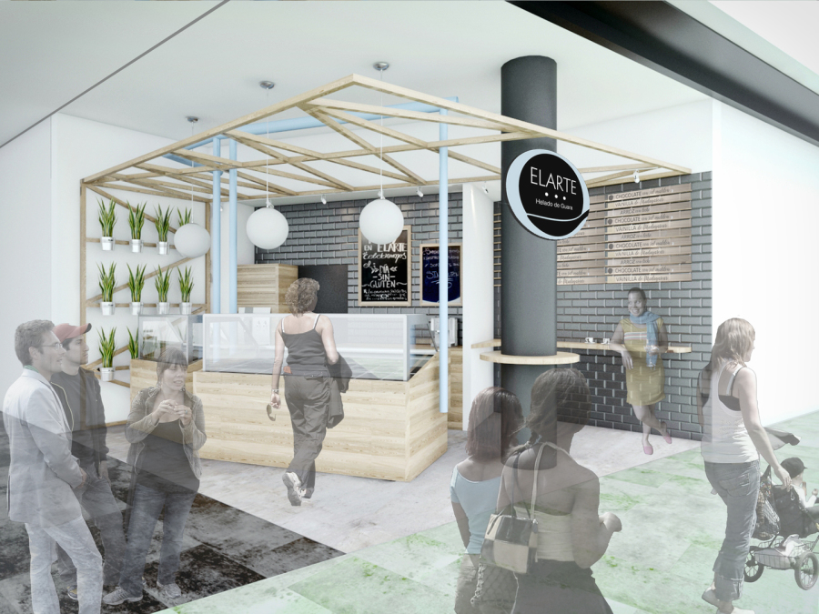 El programa funcional es sencillo, pues consta de un pequeño almacén y de un espacio de venta compuesto por tres elementos fijos (mostrador de helado, mostrador de topping, y máquina de helado soft), además de una pequeña barra de servicio. El reto que nos plantea el cliente es tratar de conseguir un espacio dentro del propio local destinado a la degustación de productos.